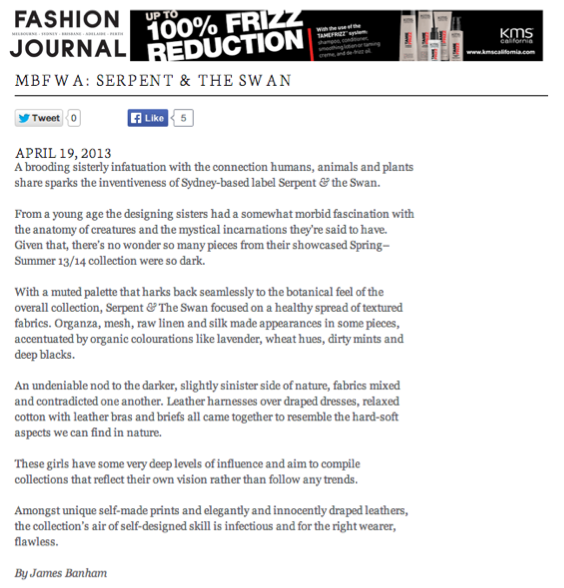 Fashion Journal: Serpent and the Swan, 19 April 2013 19/04/201311/07/2021 • James B See it online: http://fashionjournal.com.au/2013/04/19/mbfwa-serpent-the-swan/ Share with your colleagues Click to share on LinkedIn (Opens in new window) LinkedIn Click to email a link to a friend (Opens in new window) Email Click to print (Opens in new window) Print Like Loading... Related