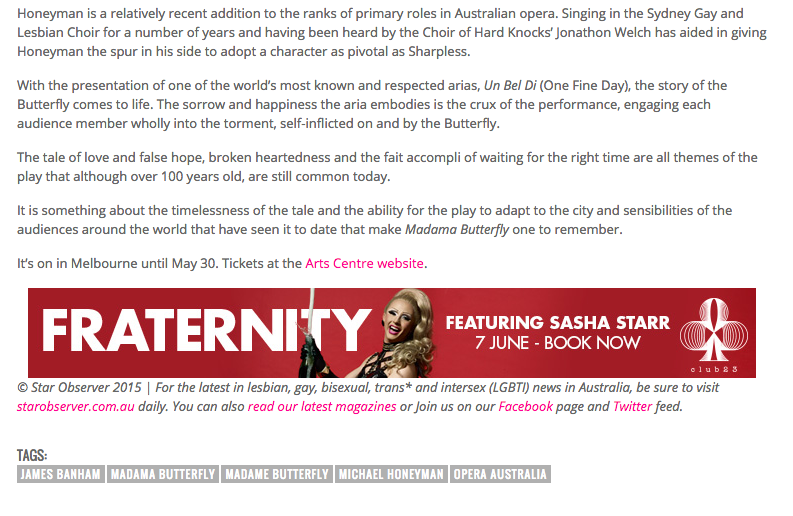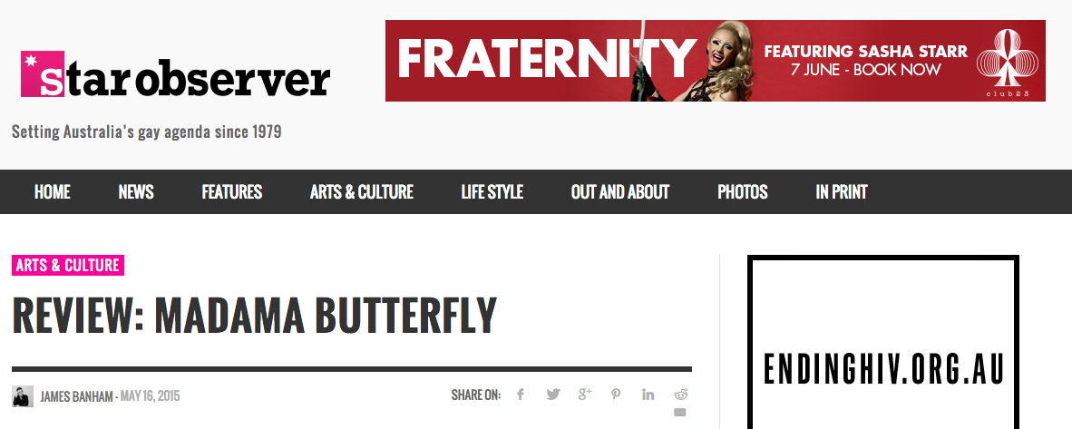 Star Observer: Madama Butterfly, 16 May 2015 16/05/201511/07/2021 • James B See online: starobserver.com.au/madama-butterfly Share with your colleagues Click to share on LinkedIn (Opens in new window) LinkedIn Click to email a link to a friend (Opens in new window) Email Click to print (Opens in new window) Print Like Loading... Related