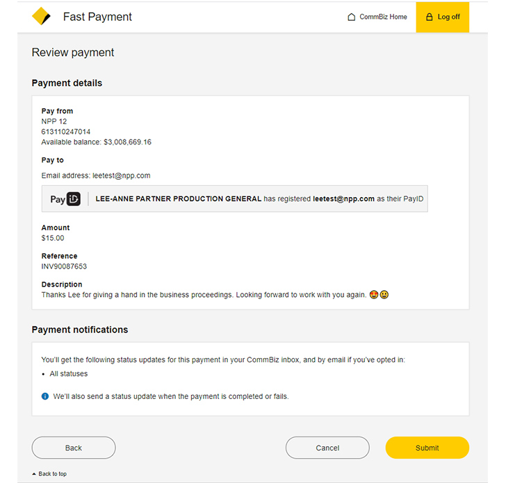 In response to Reserve Bank of Australia’s (RBA) introduction of the New Payments Platform (NPP). We engaged Osko by PayPal as provider to work with the enterprise banking CommBiz platform. This met requirements and allowed customers to make instantaneous payments to second parties in near real time using a PayID (email, mobile no., etc.).